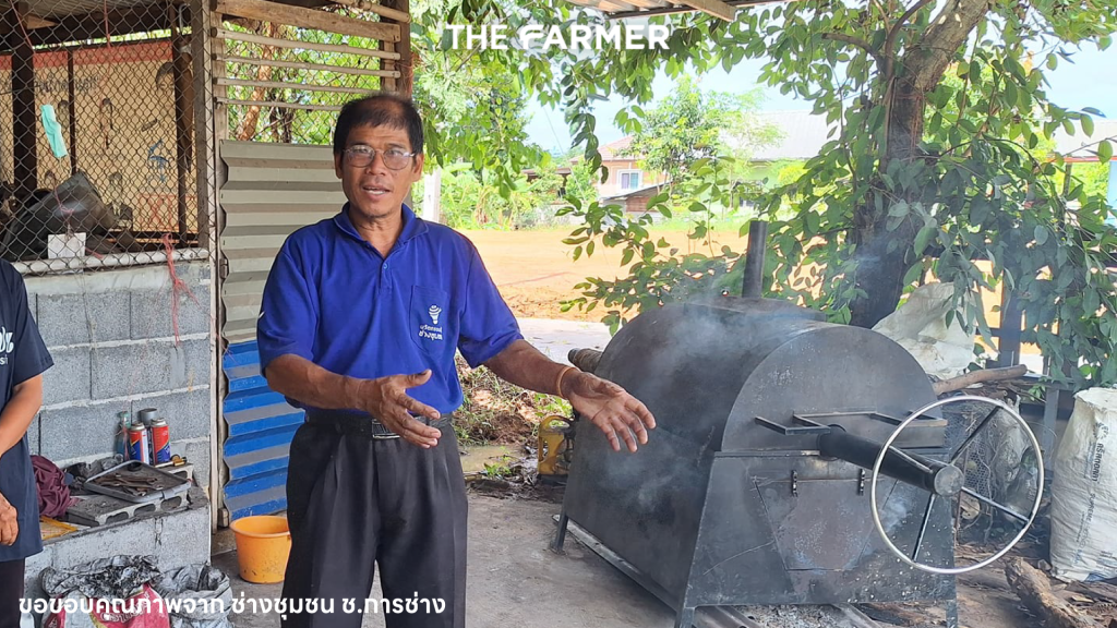 - คุณอำพล เทียนทองคำ ประธานวิสาหกิจชุมชนถ่านรักโลก อ.หนองเรือ จ.ขอนแก่น เจ้าของนวัตกรรม เครื่องอบถ่านจากวัสดุการเกษตรแบบมือหมุน